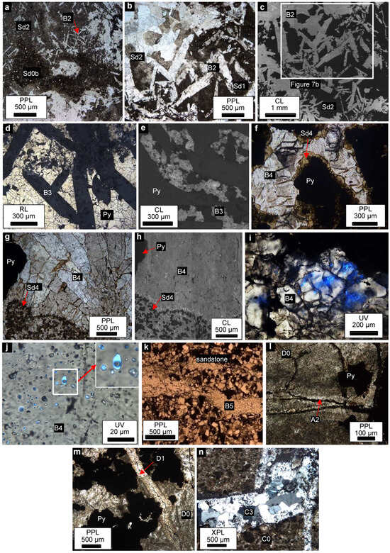 Walton mineralogy in PPL, XPL, RL, CL, and UV light (see Figure 5 for terminology). (a) Sideritic Pembroke breccia (Sd0b) recrystallised to siderite 2 (Sd2) with overgrowths of baryte 2 (B2) laths. (b,c) Baryte laths (B2) overgrowing recrystallised siderostone (Sd2). B2 has bright CL. (d,e) Baryte pseudomorphs after sulphate (B3) with mostly bright CL. (f–h) Late siderite (Sd4) and baryte 4 (B4) cements. Radial B4 exhibits uniformly dull luminescence. (i,j) Photomicrographs of hydrocarbon inclusions (i.e., petroleum) in baryte under UV light showing light blue fluorescence. (k) Baryte vein (B5) crosscutting the Horton Group sandstone. (l,m) Fracture-related ankerite (A2) and dolomite veins (D1) crosscutting dolostone and pyrite. (n) Closeup of crosscutting C3 veins in C0. Mineral abbreviations from Whitney and Evans [73].