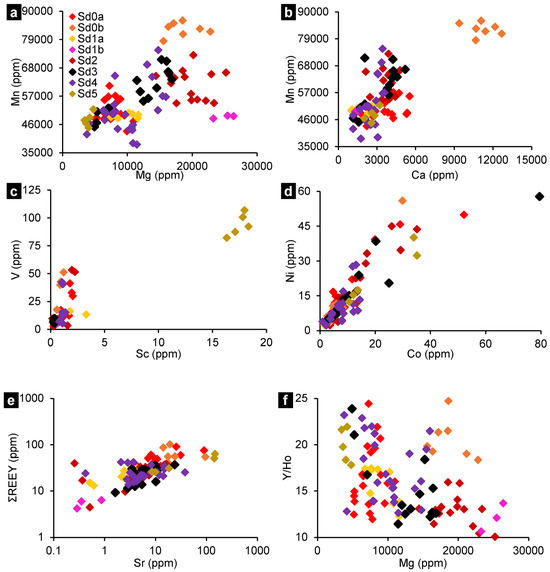 (a–f) Bivariate plots of trace elements in siderite determined by LA-ICP-MS spot analyses. Sd0a—siderostone (Macumber Formation), Sd0b—siderostone (Pembroke breccia), Sd1a—siderite 1 (core), Sd1b—siderite 1 (rim), Sd2—siderite 2, Sd3—siderite 3, Sd4—siderite 4, and Sd5—(siderite 5).