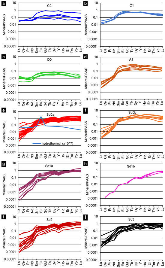 The carbonates with convex-like patterns are C0, C1, D0, D1, and C2, whereas patterns for A1, Sd1–Sd5, and C3 are mostly LREE-depleted. The LREE-depleted patterns are further subdivided based on the presence of positive (C3) or negative (A1 and Sd1-Sd5) Y anomalies. Two out of five spot analyses of Sd5 are relatively flat. Most spot analyses have a positive Ce anomaly (Figure 11).