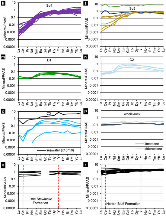 Representative PAAS-normalised [76] plots of LA-ICP-MS analyses of different carbonate phases: calcite (a,b,n,o), dolomite (c,m), ankerite (d), and siderite (e–l). Reference patterns for hydrothermal fluids in (e) from Bau and Dulski [77], Fe-Mn crusts and Mn carbonate in (l) from Bau et al. [78] and Zhang et al. [79], respectively, and seawater in (o) from Bau et al. [80]. (p) PAAS-normalised plot of whole-rock data of Macumber Formation limestone and siderostone from Sangster et al. [33]. (q) PAAS-normalised plot of whole-rock data of the Little Stewiacke Formation (equivalent of the Horton Bluff Formation in the St. Mary’s sub-basin) from Murphy [81]. (r) PAAS-normalised plot of whole-rock data of the Horton Bluff Formation from Goodarzi et al. [82]. C0—limestone, C1—calcite 1, D0—dolostone, A1—ankerite 1, Sd0a—siderostone (Macumber Formation), Sd0b—siderostone (Pembroke breccia), Sd1a—siderite 1 (core), Sd1b—siderite 1 (rim), Sd2—siderite 2, Sd3—siderite 3, Sd4—siderite 4, Sd5—(siderite 5), D1—dolomite 1, C2—calcite 2, and C3—calcite 3.