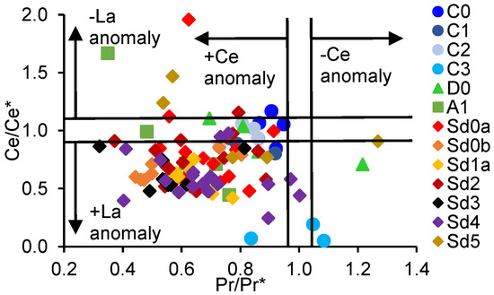(Pr/Pr*)SN versus (Ce/Ce*)SN Ce and La anomalies plot (after [75]) of Walton carbonates. Pr* = Pr/(0.5*CeSN + 0.5*NdSN). Ce* = Ce/(0.5*LaSN + 0.5*PrSN). SN = normalised to PAAS. C0—limestone, C1—calcite 1, D0—dolostone, A1—ankerite 1, Sd0a—siderostone (Macumber Formation), Sd0b—siderostone (Pembroke breccia), Sd1a—siderite 1 (core), Sd1b—siderite 1 (rim), Sd2—siderite 2, Sd3—siderite 3, Sd4—siderite 4, Sd5—(siderite 5), D1—dolomite 1, C2—calcite 2, and C3—calcite 3.