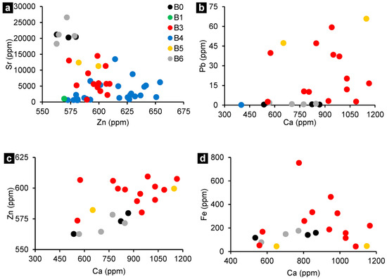 The REEY in baryte are mostly below the limit of detection (<LOD) and therefore are not further discussed. Other trace element data are summarised according to the different baryte types above (B0-B6) in Figure 12. For some of the elements there is a separation of the data in terms of type. Strontium shows a large variation from <LOD to 2.7 wt. % with the highest values in B0 and B6 (avg. = 2.12 wt. %), intermediate values for B3 and B5 (avg. = 0.74 wt. %), and the least enrichment for B1 and B4 (avg. = 0.37 wt. %). This range in Sr is larger than that reported by Burtt [29] (0.06 to 1.45 wt. %). The same occurs for Zn, but with a limited spread from 550 to 650 ppm with the highest values (avg. = 616.54 ppm; n = 16) in tabular B4. Additionally, Zn shows a negative correlation with Sr (Figure 12a). Both Ca (avg. = 897.72 ppm; n = 13) and Pb (avg. = 23.03 ppm; n = 13) are higher in B3 than in other baryte types but lack any correlation, whereas Zn and Ca show a positive trend (Figure 12b,c). Iron is low in baryte (<800 ppm) and generally <LOD except for B3 (Figure 12d). The complete dataset is available in ESM S2.