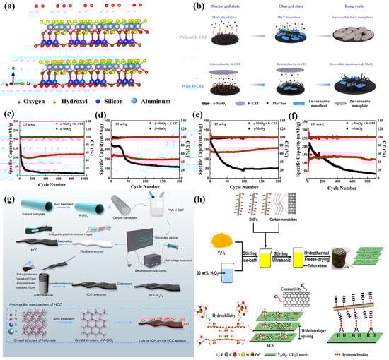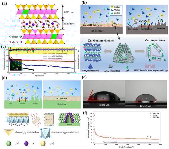 - Wang, Y.; Fan, Y.; Liao, D.; Wu, Y.; Yu, Y.; Hu, C. Highly Zn2+-conductive and robust modified montmorillonite protective layer of electrodes toward high-performance rechargeable zinc-ion batteries. Energy Storage Mater. 2022, 51, 212–222. [Google Scholar] [CrossRef]