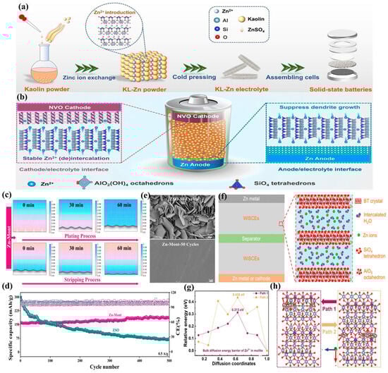 - Zhou, C.; Wang, Z.; Nan, Q.; Wen, H.; Xu, Z.; Zhang, J.; Zhao, Z.; Li, J.; Xing, Z.; Rao, P.; et al. Simultaneous Inhibition of Vanadium Dissolution and Zinc Dendrites by Mineral-Derived Solid-State Electrolyte for High-Performance Zinc Metal Batteries. Angew. Chem. Int. Ed. 2024, 63, e202412006. [Google Scholar] [CrossRef]