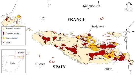 - Denèle, Y.; Laumonier, B.; Paquette, J.-L.; Olivier, P.; Gleizes, G.; Barbey, P. Timing of granite emplacement, crustal flow and gneiss dome formation in the Variscan segment of the Pyrenees. In The Variscan Orogeny: Extent, Timescale and the Formation of the European Crust; Geological Society, London, Special Publications: London, UK, 2014; Volume 405, pp. 265–287. [Google Scholar] [CrossRef]