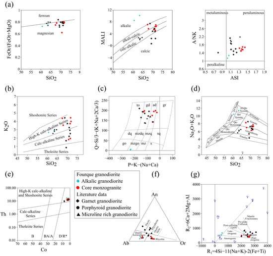 - Frost, B.R.; Barnes, C.G.; Collins, W.J.; Arculus, R.J.; Ellis, D.J.; Frost, C.D. A geochemical classification for granitic rocks. J. Petrol. 2001, 42, 2033–2048. [Google Scholar] [CrossRef]