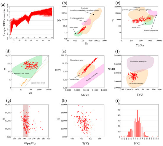 - Belousova, E.; Griffin, W.; O’Reilly, S.Y.; Fisher, N. Igneous zircon: Trace element composition as an indicator of source rock type. Contrib. Mineral. Petrol. 2002, 143, 602–622. [Google Scholar] [CrossRef]