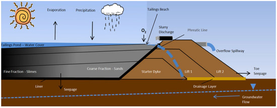 Figure 1. Various factors involved in a tailings dam (modified from The International Network for Acid Prevention [4]).