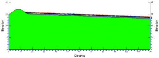 For the simulations, the tailings-dam dimension and deposition information were referred from Williams et al. [22]. A 2D sketch of the tailings deposition in a dam is shown in Figure 3. With the focus being on the effects of the deposited tailings on the stability of the dam, two major groups of materials were considered: (1) the dam material covering the embarkment and the old deposited and settled tailings (green part in Figure 3) and (2) tailing materials representing the considered deposited tailings (the grey layers at the top of dam basin). The simulated dam material region has a length of 120 m at the bottom and a height of 30 m at the left side. The top isosceles trapezoidal part of the dam material region has a height of 4.0 m, a top width of 4.0 m, and a bottom width of 16 m (leading to 33.7 degrees for the left and right slopes). The top surface of the basin has a slope of around 3.3%. Williams et al. [22] has noted that the cyclic deposition of 0.3 m thick tailings with at least 4 weeks between the deposition cycles allows the tailings to settle, drain, and desiccate. Such a deposition rate is expected to provide a factor of safety between 2.1 and 1.4 with respect to the rate of rise. In the simulations, the tailings were added on the top of the dam material layer by layer, each layer with a thickness of 0.3 m. Different thicknesses were also considered. After the settlement of each deposition layer for a certain time, the properties of the layers would change. The properties of the layers were set to different values. A total of six deposition layers of tailings on top of the dam material in the basin was considered in the simulations.