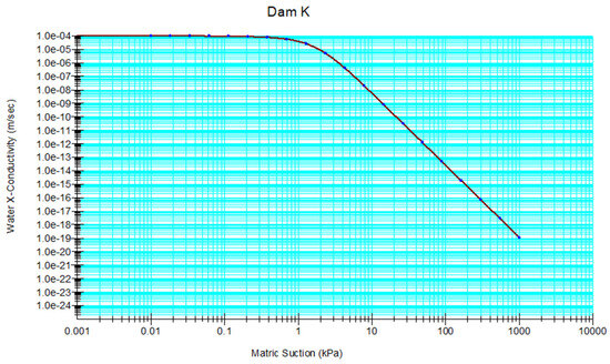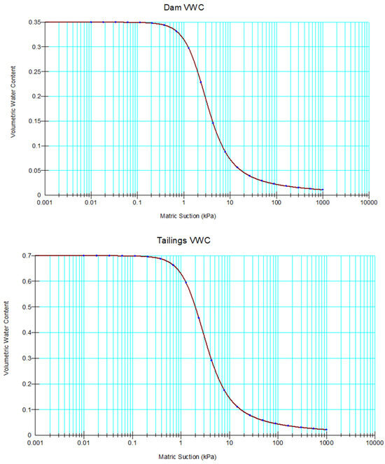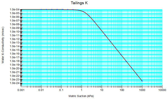 The dam material was assumed as isotropic elastic while the tailing materials as soft soil. Critical-state soil mechanics (CSSMs) principles were used for the tailings. The tailings characteristics and model parameters were taken from various studies, and the values of parameters of fresh tailings are listed in Table 1 [22,24,25], which may not directly relate to the characteristics of a particular tailing material. They have been taken to understand the effect of the tailings-deposition process on the dam stability. The parameter K0 is the coefficient of earth pressure at rest—the ratio of effective horizontal stress to effective vertical stress when there is no lateral deformation—and it is calculated. The parameters λ = 0.15 and κ = 0.03 were employed in the CSSM analysis. The volumetric water content and the hydraulic conductivity depend on the suction pression, and the relations for dam material and fresh tailings are shown in Figure 4 and Figure 5. The Van Genuchten function was employed for hydraulic conductivity estimation. Different values of hydraulic conductivity were also considered to investigate its influence. In this study, the ratio between the horizontal and vertical hydraulic conductivities Kx/Ky is assumed to be 1. Activation pore water pressure (APWP) for all materials is assumed to be zero. It must be noted here that these parameters are taken without considering any specific dam or materials and, hence, may not represent the actual properties.