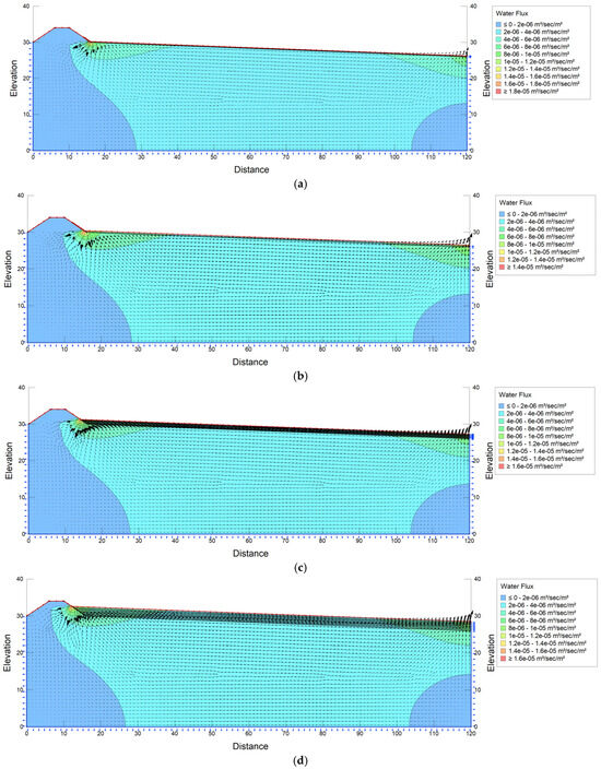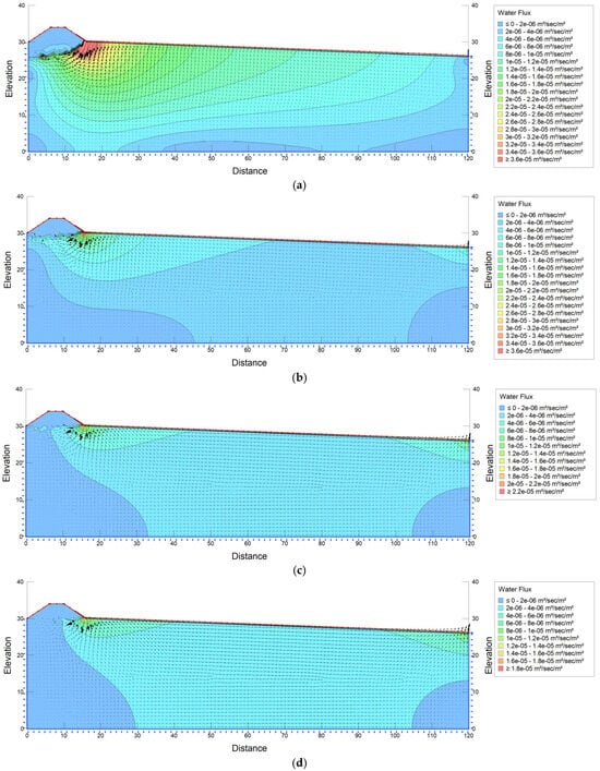 Figure 12. Distributions of water flux in the tailing dam after six-days settlement of the first and sixth deposition increment for two thicknesses: (a) first increment of 0.2 m thick layers, (b) first increment of 0.4 m thick layers, (c) sixth increment of 0.2 m thick layers, (d) sixth increment of 0.4 m thick layers.