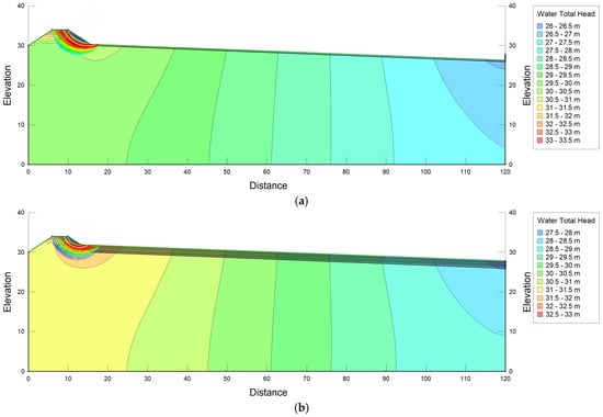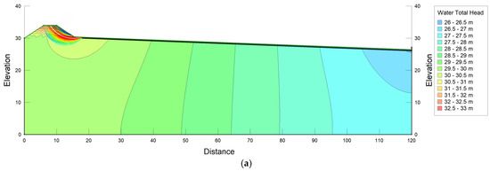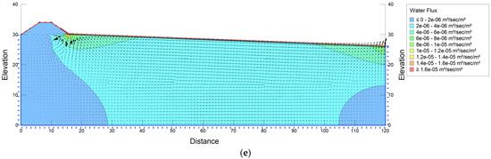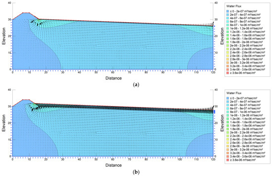 Figure 16. Distributions of water flux in the tailing dam after (a) twenty-eight-days settlement of the first deposition and (b) twenty-days settlement of the sixth deposition, with 5.0 × 10−5 m/s hydraulic conductivity and 1.0 × 10−7 m3/s/m2 flux on the boundaries.
