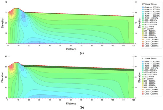 Figure 11. SIGMA/W model showing shear stress (XY) distribution with (a) one layer and (b) six layers of tailings after six days settlement.
