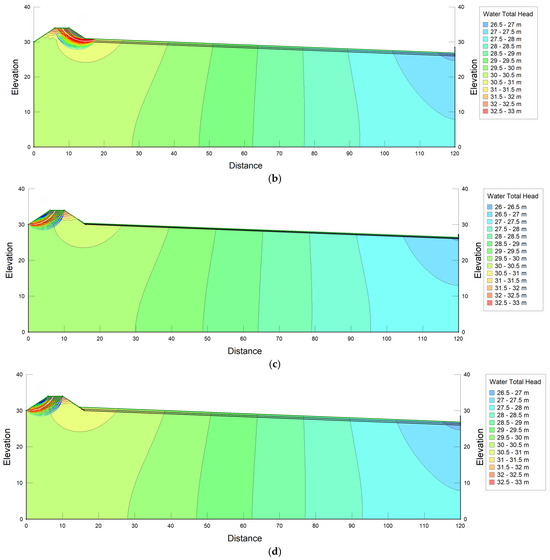 Figure A2. SEEP/W model showing pore water pressure after six days transient condition with (a) two layers, (b) three layers, (c) four layers, and (d) five layers of tailings.