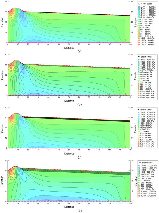 Figure A5. SEEP/W model showing the shear stress (XY) distribution with (a) two layers, (b) three layers, (c) four layers, and (d) five layers, of tailings after six days settlement.