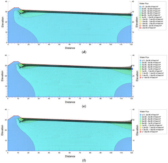 Figure 17. Distributions of water flux in the tailing dam at the first deposition increment with boundary flux: (a) 5.0 × 10−7 m3/s/m2, (b) 1.0 × 10−8 m3/s/m2, (c) no flow, and at the sixth deposition increment with boundary flux (d) 5.0 × 10−7 m3/s/m2, (e) 1.0 × 10−8 m3/s/m2, (f) no flow.