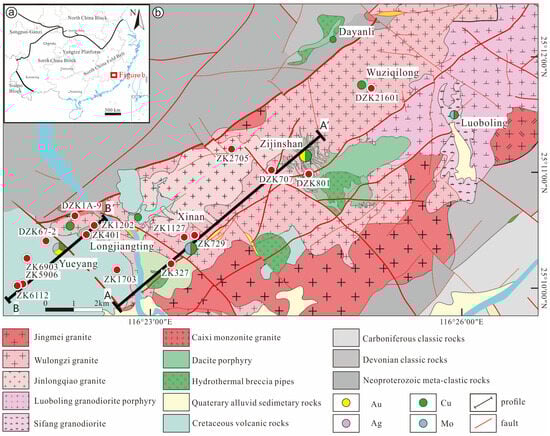 (a) Tectonic map showing the location of the study area. (b) Regional geological map and drill hole location map of the Zijinshan ore field (modified from [5,26]).