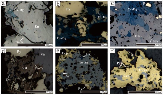 Reflected light images of the fahlores and associated minerals in the Zijinshan Au-Cu deposit. (a) Te-rich tennantite replacing enargite in the upper part of the Zijinshan Au-Cu deposit (ZK2705-7, z = 723.41 m); (b) Te-rich tennantite replaced by covellite (ZK2705-9, z = 679.01 m); (c) Te-rich tennantite replacing enargite in the central part of the Zijinshan Au-Cu deposit (ZK2705-17, z = 257.51 m); (d) Te-rich tennantite replacing colusite in the deep part of the Zijinshan Au-Cu deposit (ZK2705-47, z = 57.03 m); (e) Zn-rich tennantite associated with wolframite in the deep part of the Zijinshan Au-Cu deposit (ZK2705-53, z = −21.75 m); (f) Zn-rich tennantite in the deep part of the Zijinshan Au-Cu deposit (ZK2705-54, z = −36.95 m). Abbreviations: Py—pyrite; Ccp—chalcopyrite; Cv—covellite; Dg—digenite; En—enargite; Col—colusite; Wit—wittchenite; Wol—wolframite; Sp—sphalerite; Gn—galena; Tts—tetrahedrite-tennantite solid solution.
