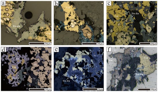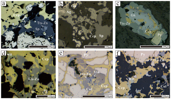 Mineral association of fahlores in Yueyang deposit under reflected light. (a) fahlores associated with sphalerite, pyrite and chalcopyrite in the upper part of Yueyang deposit (ZK5906-7, z = 47.48 m); (b) coexistence of galena, sphalerite, chalcopyrite, and argentite (ZK6903-6, z = 63.59 m); (c) fahlores replacing and enclosing pyrite, chalcopyrite, and galena (ZK1703-17, z = 181.19 m); (d) mineral association of fahlores, chalcopyrite, galena, and emplectite in the deep right part of the Yueyang deposit (DZK67-2-7, z = −82.34 m); (e,f) Fahlores, chalcopyrite, galena, colusite, wittchenite and vinciennite filling the fractures of pyrite (DZK67-2-8, z = −79.12 m). Abbreviations: Py—pyrite; Ccp—chalcopyrite; Col—colusite; Vin—vinciennite; Wit—wittchenite; Sp—sphalerite; Gn—galena; Tts—tetrahedrite-tennantite solid solution.