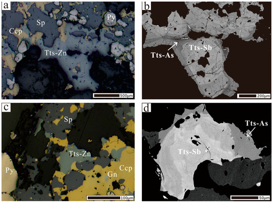 Reflected light images and BSE images of the zoning of fahlores in the Xi’nan deposit. (a) Zn-rich tetrahedrite replacing sphalerite and chalcopyrite (ZK1127-14, z = 241.5 m); (b) oscillatory zoning of Zn-rich tetrahedrite in BSE image of Figure (a); (c) Zn-rich tennantite replacing chalcopyrite and sphalerite (ZK729-14, z = 237.38 m); (d) zoning of tennantite in BSE image of Figure (c). Abbreviations: Py—pyrite; Ccp—chalcopyrite; Sp—sphalerite; Gn—galena; Tts—tetrahedrite-tennantite solid solution.