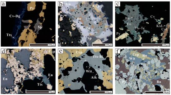 Reflected light images of the mineral associations of fahlores in Longjiangting deposit. (a) fahlores intergrowth with covellite and digenite (ZK1202-5, z = 223.62 m); (b) fahlores associated with bornite and chalcopyrite replaced by covellite-digenite (DZK1A-9-2, z = 224.9 m); (c) replacement of enargite by Te-rich tennantite and replacement of bornite by covellite (DZK1A-9-12, z = 115.99 m); (d) replacement of enargite by Zn-rich tennantite (DZK1A-9-12, z = 115.99 m); (e) replacement of chalcopyrite by fahlores and aikinite (ZK401-32, z = 51.23 m); (f) coexisting of roquesite with wittchenite and chalcopyrite (ZK401-34, z = 43.23 m). Abbreviations: Py—pyrite; Ccp—chalcopyrite; Cv—covellite; Dg—digenite; En—enargite; Col—colusite; Sp—sphalerite; Gn—galena; Aik—aikinite; Kid—kiddcreekite; Wit—wittchenite; Ro-roquesite; Tts—tetrahedrite-tennantite solid solution.