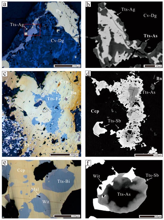 Reflected light images and BSE images of the zoning of fahlores in the Longjiangting deposit. (a) Ag-tetrahedrite and covellite in the Longjiangting deposit (ZK1202-5, z = 223.62 m); (b) zoning of tetrahedrite replaced by covellite in BSE image of Figure (a); (c) solid solution of chalcopyrite and fahlores enclosing pyrite and bornite (DZK1A-9-7, z = 170.99 m); (d) zoning of fahlores in BSE image of Figure (c); (e) Bi-rich fahlore, coexisting with matildite and wittchenite, replacing chalcopyrite (DZK1A-9-18, z = 37.99 m); (f) BSE image showing zoning of fahlores with As-rich cores and Sb-rich rims. Abbreviations: Py—pyrite; Ccp—chalcopyrite; Cv—covellite; Dg—digenite; En—enargite; Mal—matildite; Sp—sphalerite; Gn—galena; Wit—wittchenite; Tts—tetrahedrite-tennantite solid solution.