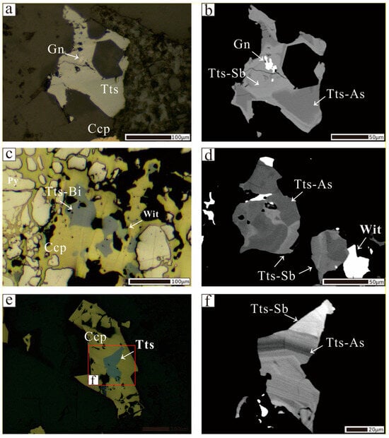 Zoning of fahlores in the Yueyang deposit and their BSE images. (a) Self-growth zoning of fahlores (ZK6903-3, z = −0.59 m); (b) zoning of fahlores associated with Bi minerals in the BSE image of Figure (a); (c) replacement of chalcopyrite by tetrahedrite and emplectite (DZK67-2-8, z = −79.126 m); (d) zoning of fahlores in BSE image of Figure (c); (e) chalcopyrite enclosing Tts (DZK67-2-7, z = −82.341 m); (f) oscillatory zoning of tetrahedrite enclosed by chalcopyrite in Figure (e). Abbreviations: Py—pyrite; Ccp—chalcopyrite; Wit—wittchenite; Gn—galena; Tts—tetrahedrite-tennantite solid solution.