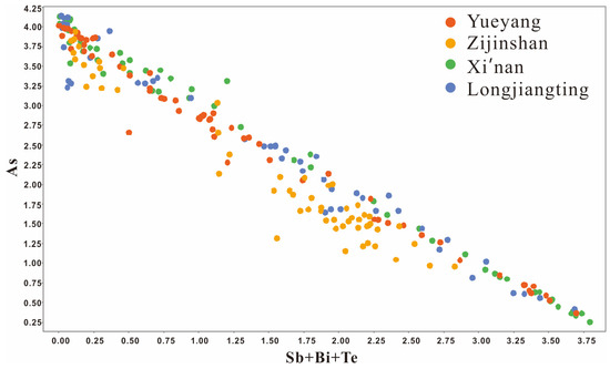 Plot of As and (Sb+Bi+Te) atomic number relationship of the fahlores in the Zijinshan ore field.