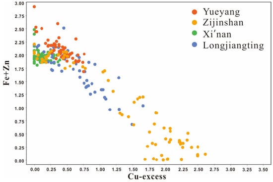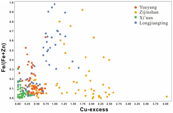 Plot of the relationship between Cu-excess and Fe/(Fe+Zn) in fahlores from the Zijinshan ore field.