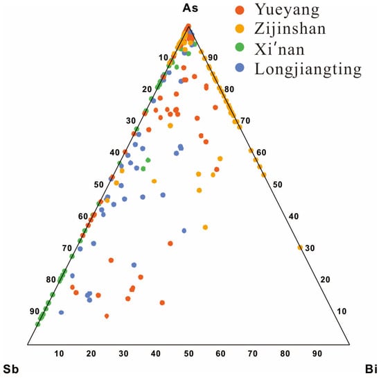 The ternary diagram of As, Sb, and Bi in the fahlores in the Zijinshan ore field.