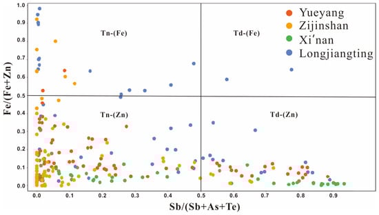Plot of the relationship between Sb/(Sb+As+Te) and Fe/(Fe+Zn) in fahlores from the Zijinshan ore field. Tn—tennantite; Td—tetrahedrite.