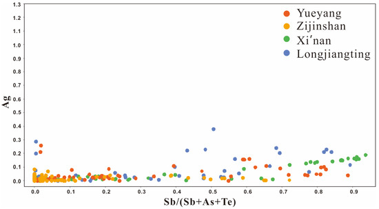 Plot of the relationship between Ag and Sb/(Sb+As+Te) in fahlores from the Zijinshan ore field.