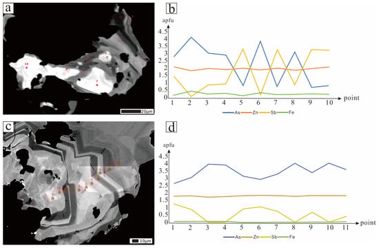 In the Zijinshan Xi’nan deposit, the grain size of the fahlores gradually increases from deep to shallow levels, and zoning is commonly observed in BSE images. In the shallowest part, fahlores grow along the edges of chalcopyrite (Figure 3a), replacing chalcopyrite in anhedral forms. These grains are larger than 200 mm and appear light grayish-green under a microscope. BSE images reveal distinct oscillatory zoning, with zones larger than 20 mm showing regular variations. The core is enriched in Sb, while the outer zones alternate between As-rich and Sb-rich, with the As content steadily increasing outward. At deeper levels, the BSE images show tetrahedrite with oscillatory zoning surrounding an earlier, relatively homogeneous core. The oscillatory zones are less than 10 mm wide, while the core zones are larger than 100 mm. The core is enriched in Sb, and the outer zones are enriched in As (Figure 4a,b). In even deeper parts, fahlores replace chalcopyrite in anhedral forms and, together with sphalerite, envelop pyrite. These grains are smaller than 100 mm and appear light grayish-green under a microscope (Figure 4c,d). In most fahlores in the Zijinshan Xi’nan deposit, the zoning pattern is characterized by an Sb-rich core, gradually transitioning to As-rich edges (Table 2).