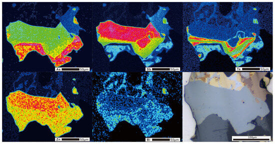 The copper mineral combination in the shallow open-pit alum mineralization zone of the Zijinshan Au-Cu deposit is characterized by Te-rich tennantite + Te-rich tetrahedrite + covellite. An EPMA analysis shows that tetrahedrite is mainly rich in Sb (up to 15.36 wt%) and Te (up to 18.81 wt%); the copper minerals in the middle level of the deposit are characterized by tin minerals, such as Te-rich tennantite + stannite + colusite ± covellite. The EPMA analysis shows that the composition of fahlores is relatively uniform, with Sb (0–1.49 wt%), Te (0–13.08 wt%), and Bi (0–8.73 wt%); the ore in the sericite alteration zone of the deep drilling of the Zijinshan Au-Cu deposit is characterized by a combination of Zn-rich tennantite + chalcopyrite ± Te-rich tennantite. The EPMA analysis shows that the mineral composition of the fahlores is rich in As (up to 20.27 wt%), Zn (up to 8.16 wt%), and Bi (up to 25.44 wt%). The fahlores in the Zijinshan Au-Cu deposit are generally rich in Te, with an increase in the enrichment of Sb and Te from deep to shallow, and a decrease in the enrichment of Zn and Bi. The mineral compositions of the fahlores from deep to shallow exhibit a change from rich in Zn, As, and Bi to rich in Te and Sb (Table 1).