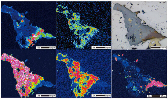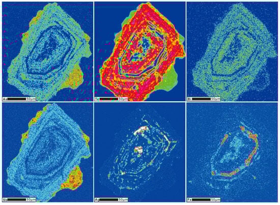 Fahlores often exhibit various types of zoning in BSE images, with oscillatory zoning being one of the more distinctive types. Based on previous research [21], the formation of oscillatory zoning in fahlores in porphyry deposits is primarily attributed to the substitution between As and Sb; in other types of deposits, zoning may result from substitutions among trivalent elements (Te, As, Sb, Bi) or divalent elements (Hg, Fe, Zn). The different zoning patterns can also provide insights into the evolution of the hydrothermal fluids [8,21,22].