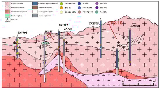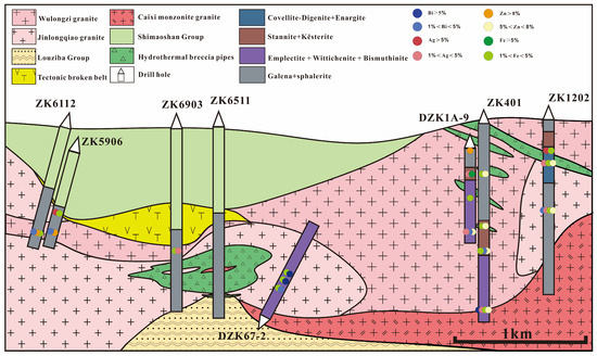 In the Yueyang deposit (ZK6112, ZK6511, ZK5906, and ZK6903), the overall mineral assemblage exhibits LS characteristics [1], including pyrite, chalcopyrite, galena, sphalerite, and argentite (Figure 7). The fahlores are enriched in Sb (up to 22.91 wt%), Zn (up to 10.30 wt%), and Ag (up to 9.59 wt%). In the deeper part of the deposit (DZK67-2), the copper mineral assemblage is characterized by chalcopyrite, aikinite, wittichenite, and emplectite, with fahlores enriched in Bi (up to 14.76 wt%) and Fe (up to 3.89 wt%). The Zn and Sb content in fahlores gradually decreases, while Cu content increases, accompanied by a trend of Bi enrichment. The fahlores in the Yueyang deposit show little variation with depth (Table 4).