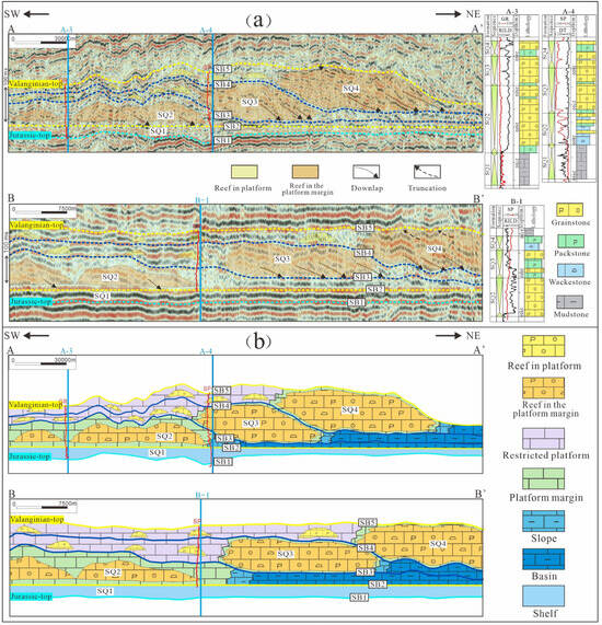 SB3 is the sequence boundary between sequence SQ3 and SQ2. Above the SB3 surface, multiple downlap reflection terminations are observed. In SQ3, above the interface, small hummocky seismic facies can be identified in the southwestern part. These hummocky reef banks are recognized at the projection of well A-3 on profile A and well B-1 on profile B. The lithology is primarily grainstone, representing localized reef banks developed within the platform interior. In the middle of SQ3, the thickness increases, showing poor continuity, weak amplitude, and obvious progradational features. At the A-4 well projection on Profile A, the SP log curve of SQ3 displays a box shape, with the primary lithology being grainstone, indicating a rapidly deposited platform margin area. To the northeast, the SQ3 sequence gradually thins, exhibiting medium to good continuity and medium to strong amplitude, suggesting a transition towards the slope-basin area in the northeast direction (Figure 4a,b).