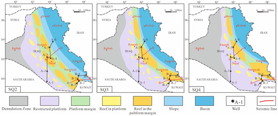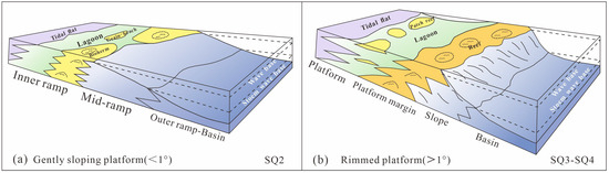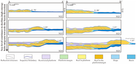 - Each sequence from SQ2 to SQ4 develops in a basin-slope-platform margin-restricted platform configuration, with large reefs developed in each sequence. Vertically, the facies prograde to the northeast. During the SQ2 period, the platform margin dip angle (<1°) indicates a ramp-type platform margin. In the SQ3 and SQ4 sequences, the platform margin dip angle is larger (1.2–1.5°), indicating a rimmed platform margin.