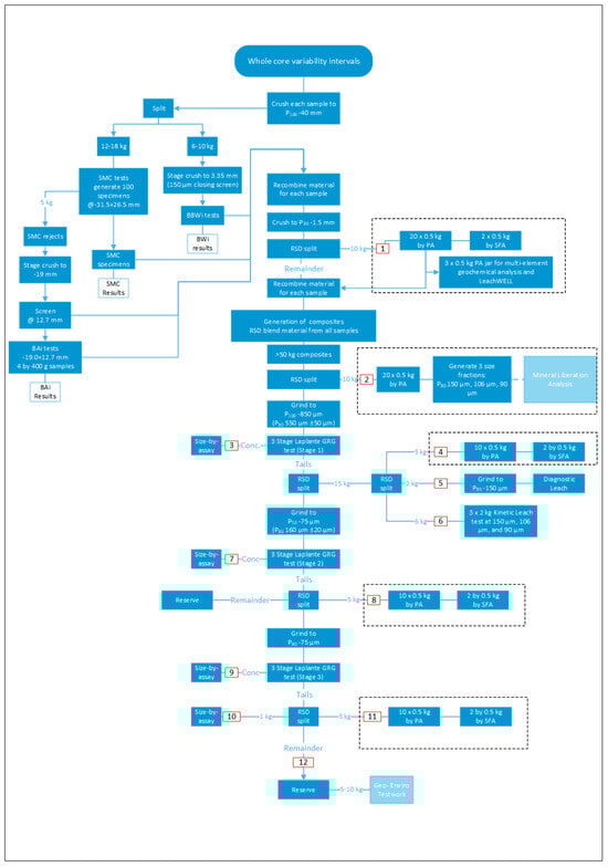 The protocol can be modified as required. This may include the use of variability samples throughout, with no compositing for recovery testwork (Figure 11), if mineralisation is less heterogeneous (smaller samples appropriate) or wider intersections are available. The costly BWI and SMC testwork could be replaced by the rapid/cost-effective Geopyora method, which requires a core to be crushed, but a few kg versus c. 30 kg [33]. The protocol has already been applied elsewhere by the primary author (SCD), with the key modification being the use of primary variability intervals (no compositing) and additional data collection through core spectral scanning and EQUOtip measurements.