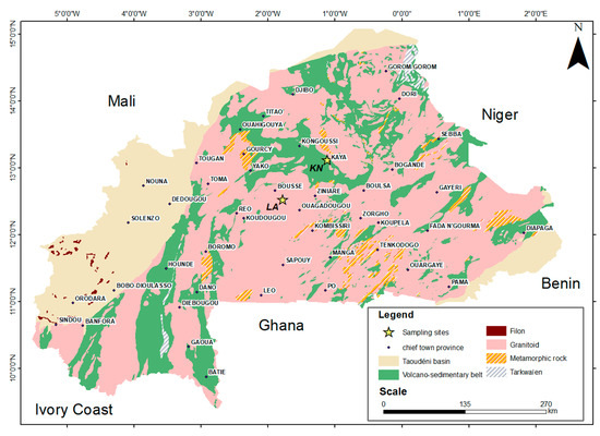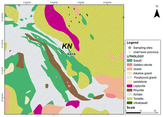 This site belongs to the Kaya square degree, located between latitudes 13° and 14° north and longitudes 1° and 2° west. The geological formations are primarily composed of volcanic and volcano-sedimentary rocks (Figure 2). These rocks form relief areas, while the flat vast regions, at altitudes ranging from 300 to 350 m, comprise granitic materials such as protoliths. From a geological point of view, the KN samples originate from the environment of Birimian rocks, stemming from andesine (with a calcic-alkaline affinity), basalt, and dacit alteration.