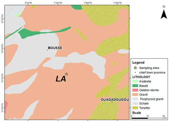 The Laye (LA) site belongs to the square degree of Ouagadougou and is located 35 km from Ouagadougou. The square degree of Ouagadougou is located between parallels 12 and 13° north latitude and meridians 1 and 2° west longitude. Unlike Kaya, this square degree is mainly composed of granite formations, corroborating its generally flat relief. The Laye site is located on highly indurated lateritic formations derived from a granitic protolith (alkaline granite). From a geological point of view, this area is located in an environment of Precambrian rocks (Figure 3).