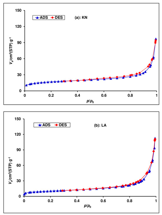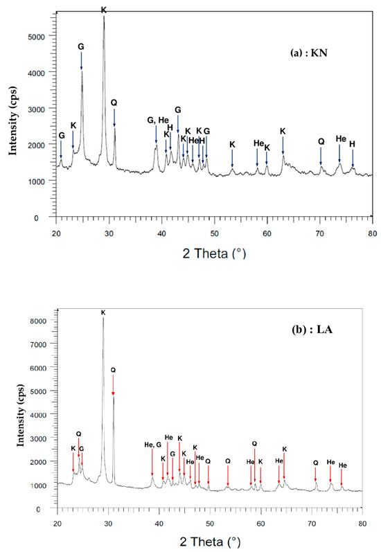 The chemical composition in Table 1 indicates the major oxides (SiO2, Al2O3, and Fe2O3) and the minor oxides (Na2O, K2O, TiO2, MgO, MnO2, and CaO) in the KN and LA samples. Other properties, such as the apparent density, total organic carbon (TOC), and organic matter (OM), are also shown in Table 1.