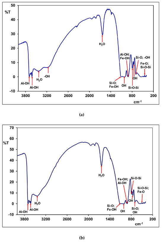 Figure 5 shows the FT-IR spectra of the laterite samples. The FT-IR spectra results distinguish three spectral domains: 3700–3400 cm−1, 1650–900 cm−1, and 800–400 cm−1, respectively. Table 5 gives the different attributions of the observed bands.