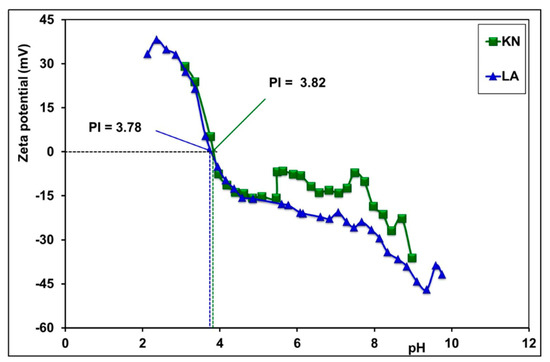 According to the literature [13,33], iron is found as oxyhydroxides. Oxides of potassium, sodium, and titanium are in small amounts in both samples. These results suggest that quartz, aluminosilicates, and iron minerals are predominant in the samples studied. The low levels of potassium, sodium, and titanium oxides indicate that compounds containing titanium, potassium, and sodium are non-existent or present in tiny proportions. The elements in KN and LA are grouped according to their family in Table 2.