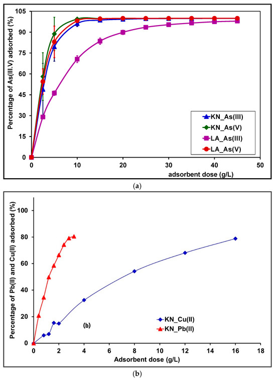 The results for the removal of Pb(II) and Cu(II) metal ions at different doses of adsorbent are presented in Figure 9b. A general trend observed was that the adsorption of heavy metal ions increased with the increase in adsorbent dose. The results show that the removal rates of Pb(II) reached 74.20 ± 0.95% (3.09 ± 0.04 mg/g) when the amount of the KN adsorbent was 2.4 g/L. For Cu(II), the adsorption rates were 54.18 ± 0.01% (0.68 ± 0.01 mg/g) when the dose of the KN adsorbent was 8 g/L. As the dose of laterite increased, the removal of Pb(II) and Cu(II) from the solutions also increased. This can be explained by the increase in functional groups on the surface of the laterite, providing a greater number of available sites to form complexes through surface complexation, or to exchange cations due to the ion exchange process [66,67,68].