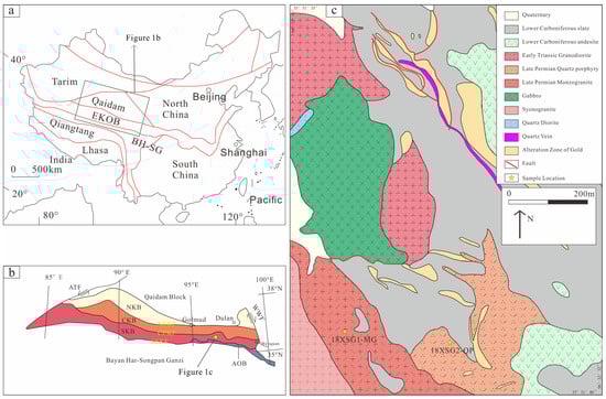 (a) Simplified tectonic map of China (after [41]). (b) Outline of tectonic map of the EKOB showing the three major faults and tectonic belts (modified from [10,39]). (c) Geological map of Xingshugou area and sample location. ATF: Altyn Tagh strike-slip fault, WWF: Wenquangou–Wahongshan fault, NEKF: Northern East Kunlun fault, CEKF: Central East Kunlun fault, SEKF: Southern East Kunlun fault, NKB: Caledonian back-arc basin of Northern East Kunlun Belt, CKB: uplifted granitic basement of Central East Kunlun Belt, SKB: composite accretion of the Southern East Kunlun Belt, AOB: A’nyemaqen Ophiolitic Belt.