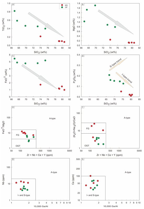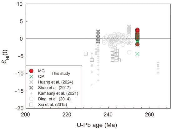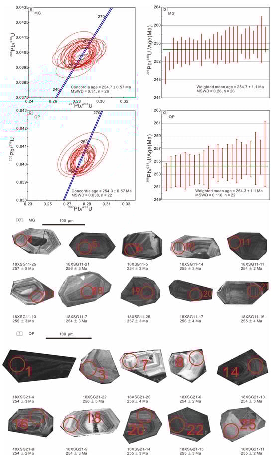 Zircon crystals from samples MG (18XSG1) and QP (18XSG2) exhibit transparent, light brown and euhedral morphologies (80–200 μm) with well-developed prismatic faces and oscillatory zoning in CL images (Figure 3c,f). High Th/U ratios (0.28–5.39) confirm their magmatic origin [46]. The zircon U-Pb isotopic data are presented in Table 1. Zircon U-Pb concordia 206Pb/238U ages of MG and QP are 254.7 ± 0.57 Ma (MSWD = 0.31, n = 26, error ellipses are at 1 sigma and age errors are at 68% confidence) (Figure 3a) and 254.3 ± 0.57 Ma (MSWD = 0.038, n = 26, error ellipses are at 1 sigma and age errors are at 68% confidence) (Figure 3d), respectively. The zircon U-Pb weighted mean 206Pb/238U ages of MG and QP are 254.7 ± 1.1 Ma (MSWD = 0.26, n = 26) (Figure 3b) and 254.3 ± 1.1 Ma (MSWD = 0.116, n = 26) (Figure 3e), respectively. Therefore, the crystallization age of both intrusions is Late Permian.