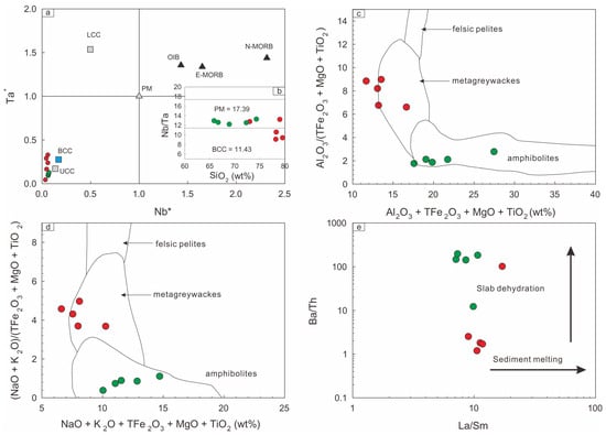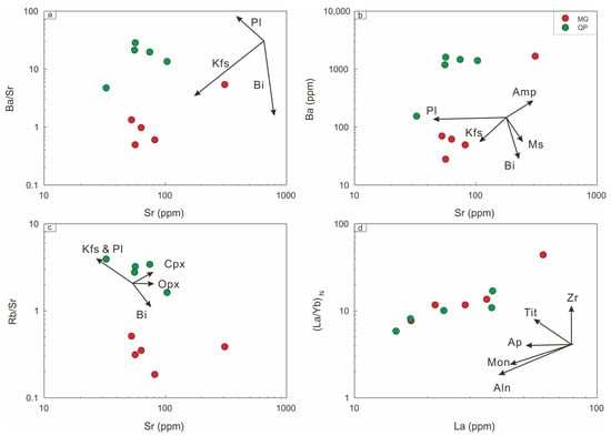 The MG shows a high SiO2 (73–80 wt%) content, but low K2O (0.3–4 wt%), TiO2 (0.1–0.2 wt%), FeOT (FeOT = FeO + Fe2O3 × 0.8998, 1–1.7 wt%), MnO (0.02–0.06 wt%), P2O5 (0.01–0.05 wt%) and MgO (0.1–0.2 wt%) contents, as well as low Mg# (Mg# = 100 × molar MgO/(MgO + FeOT), 13–20) (Figure 4b,c). The value of A/CNK (A/CNK = molar Al2O3/(CaO + Na2O + K2O)) ranges from 0.8 to 1.2 (Figure 4d). All of the above suggest that the MG is a low-K subalkaline metaluminous rock. It is enriched in light rare earth elements (LREEs) with (La/Yb)N ((La/Yb)N = (LaSample/LaCI)/(YbSample/YbCI)) values of 7–49 (Figure 5a) and large ion lithophile elements (LILEs, such as Rb and Th) (Figure 5b). Analyses also show significant negative Eu anomalies (Eu/Eu* = 0.28–0.32, with one outlier at 1.23; Eu/Eu* = (EuSample/EuCI)/{[(SmSample/SmCI) × (GdSample/GdCI)]^(1/2)}) (Figure 5a) and depletion in Ba, K, Sr, P and Ti (Figure 5b).