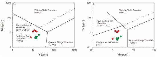 - Pearce, J.A.; Harris, N.B.W.; Tindle, A.G. Trace Element Discrimination Diagrams for the Tectonic Interpretation of Granitic Rocks. J. Petrol. 1984, 25, 956–983. [Google Scholar] [CrossRef]
