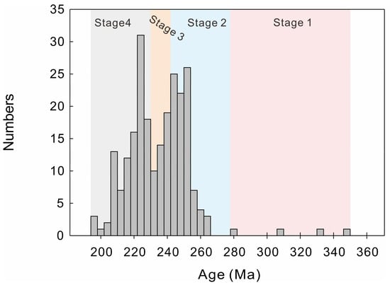 The East Kunlun Orogenic Belt (EKOB), a suggested subduction–accretion orogen, preserves multistage tectonomagmatic records associated with Cambrian–Devonian Proto-Tethys and Carboniferous–Triassic Paleo-Tethys oceanic cycles [9,10,11,12,13,14,15,16,17,18]. A consensus exists on the Paleo-Tethyan oceanic opening prior to the Early Carboniferous [19,20,21] and initial northward subduction around 278 Ma [22]. Three principal controversies persist regarding its geodynamic evolution: (1) Majority view: Prolonged subduction (278–240 Ma) followed by collisional (240–230 Ma) and post-collisional phases (230–190 Ma) [11,13,15,16,23,24,25]. (2) Alternative model 1: Early collision initiation (pre-251 Ma) transitioning to post-collisional extension by 247 Ma [26,27]. (3) Alternative model 2: Continuous subduction through the Late Triassic prior to terminal collision [28,29]. Petrogenetic investigations of EKOB granitoids document diverse magma provenance, including the following: (1) subducted oceanic plate with overlying sediments [26,30], (2) lower crust [12,31], (3) juvenile mafic crust [32,33], (4) enriched mantle [34,35], (5) hybrid mantle–crust systems [36,37].